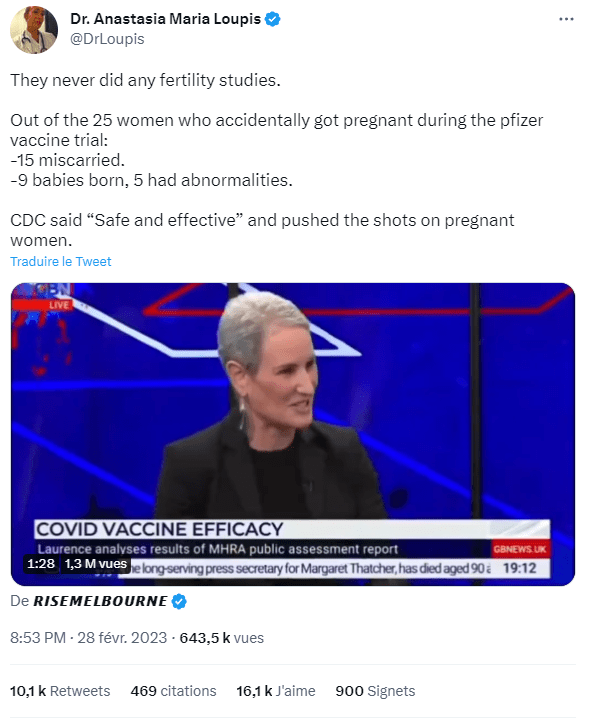 Ici relayée par Anastasia Maria Loupis – médecin danoise – le 28 février 2023, la vidéo d’1min30 est extraite de l’émission de Laurence Fox du 24 février sur Great Britain News (GBNews), une chaîne gratuite anglaise.