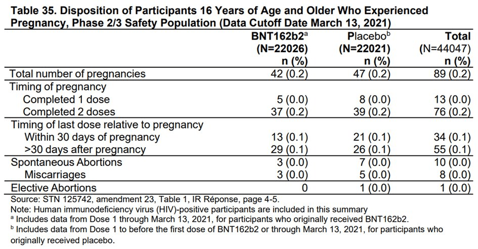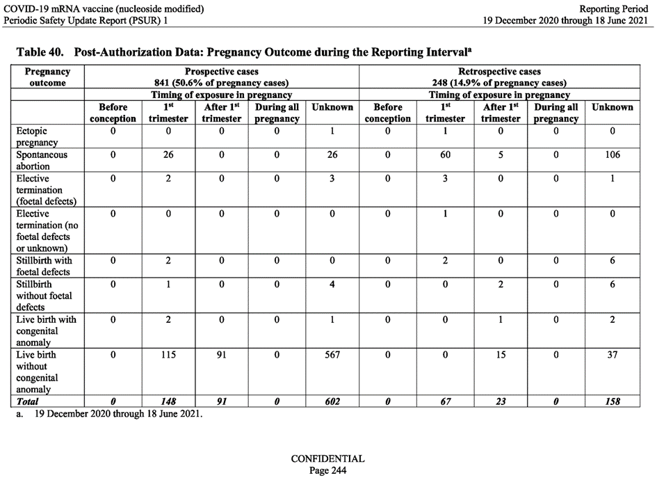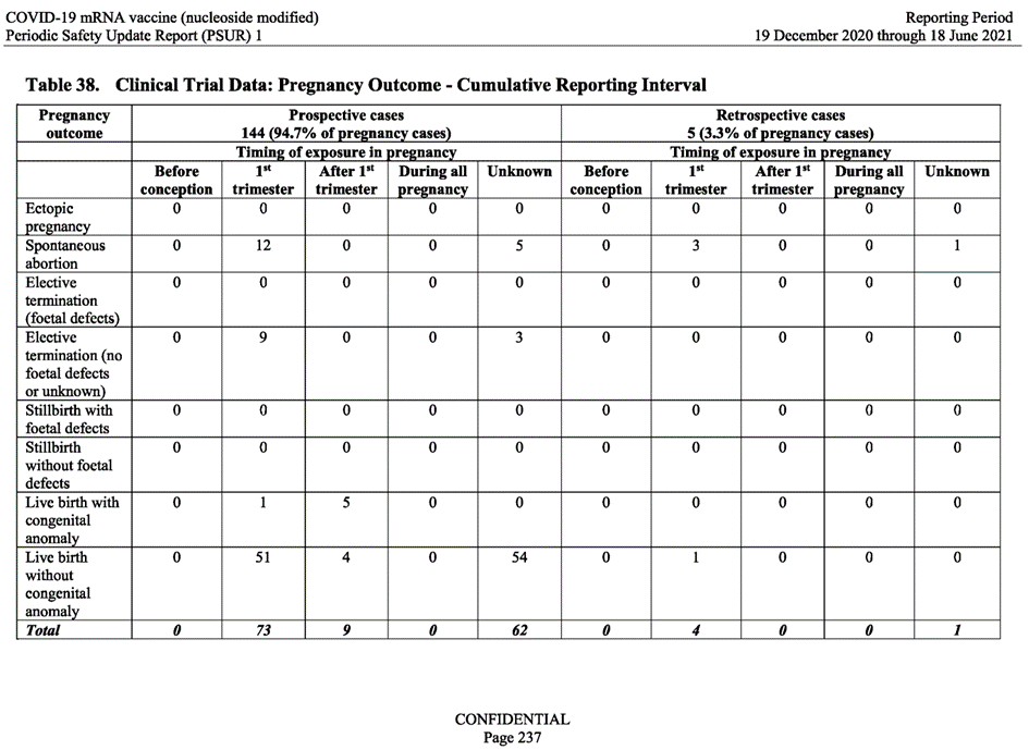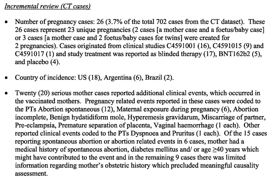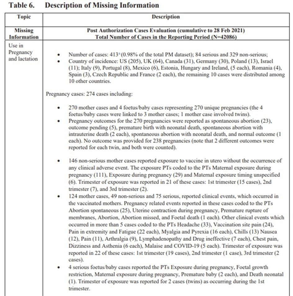 De même dans l’analyse post autorisation du vaccin du 28 février 2021, la table 6 (p.12) montre que sur 270 grossesses, 26 ont abouti en des fausses couches.