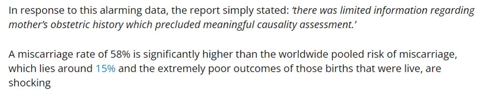 Au paragraphe sur les grossesses, elle indique que « sur 26 [grossesses], 15 ont résulté en des fausses couches et 5 grossesses ont abouti à 5 naissances avec anomalies congénitales » avant d’affirmer que cela amène donc à un « taux de 58% ».