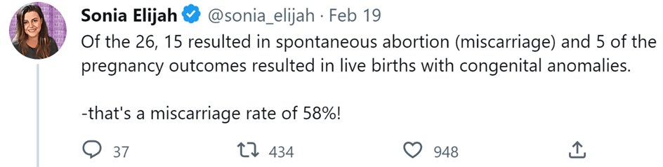 Notons en premier lieu qu’à l’origine de ce taux présumé de 58% de fausse couche se trouve S. Elijah, précédemment citée. En effet, elle est à l’origine d’un article sur le site Childrens Health Defense le 19 février 2023.