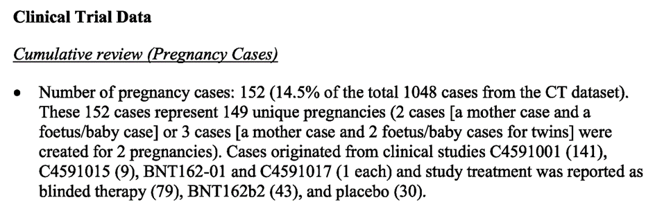 La partie sur les femmes enceintes et allaitantes (16.3.5.3.) couvre les pages 234 à 245. Dès la p.235, le rapport montre que ce sont 152 cas de grossesses – dont 149 uniques – qui ont été répertoriées dans les études cliniques C4591001, C4591015, BNT162-01 et C4591017.