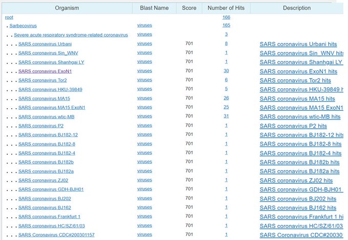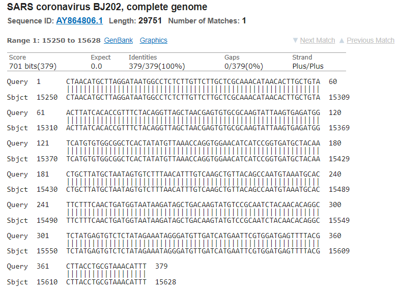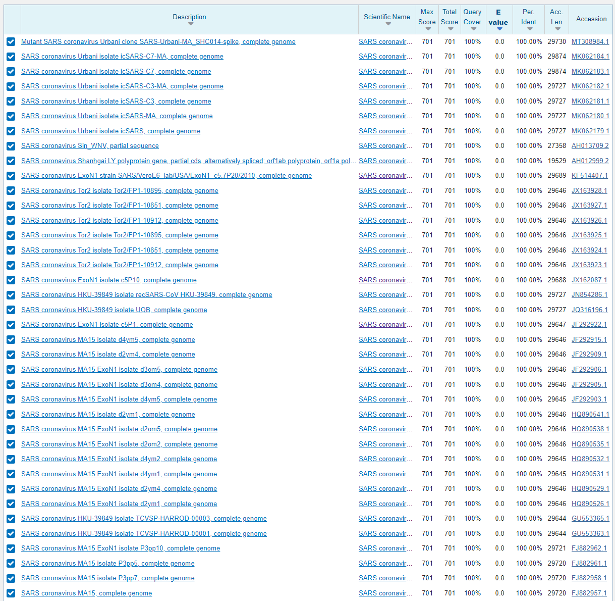 En la comparant avec la banque de donnée BLAST, les séquences de « SARS-CoV1 » & « SARS-CoV2 » correspondent toutes deux à 100% au SARS Coronavirus Urbani, soit le SARS-CoV-1 apparu en 2002.
