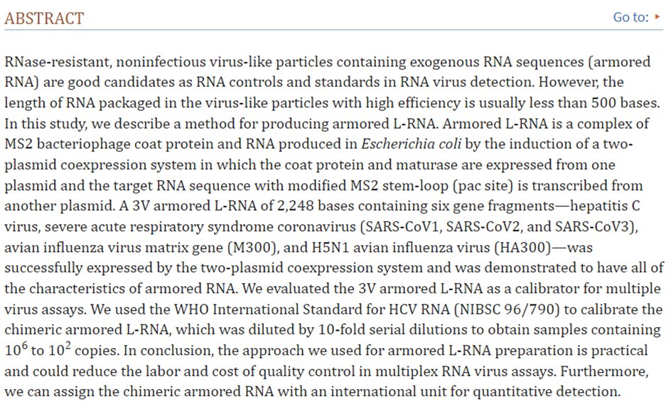 Cette publication, réalisée par une équipe de l’université de Xiamen et intitulée Preparation of a Chimeric Armored RNA as a Versatile Calibrator for Mutiple Virus Assays, s’intéresse à la création d’un « armored RNA » (AR) pour la détection de plusieurs virus. Cette dernière est possible grâce à un autre processus : combiner plusieurs fragments d’ARN des différents virus à détecter grâce à la technique de l’overlap extension PCR (SOE-PCR). Elle permet ainsi la création d’une séquence plus longue.