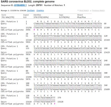 Même constat en recherchant dans BLAST la totalité de la séquence (379 nucléotides) : celle-ci correspond au SARS-CoV.
