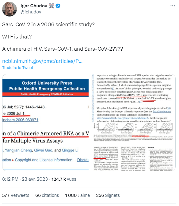 Egalement repris par quelques comptes francophones (ici et là), le tweet publié le 23 avril s’interroge sur la présence du terme « SARS-CoV2 » dans une lettre à l’éditeur de juillet 2006 sur NCBI.