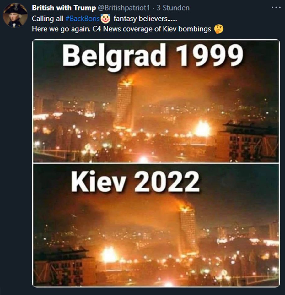 Le photomontage utilisé a pour objectif de démontrer que les médias (souvent qualifiés par ces personnes de Main Stream Media / MSM) auraient utilisé une fausse image des bombardements sur Kiev et ainsi porter le discrédit sur ces médias. Celui-ci montre la photographie originale du bombardement sur la tour Usce à Belgrade en 1999 et est comparée à la même photographie inversée sur son axe vertical afin de faire croire à une réutilisation mensongère de l’image.