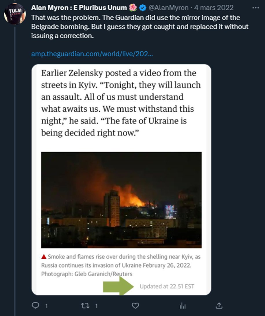 Même dans ce très long thread, commencé le 24 février 2022, recensant les mauvais usages et détournement d’images lors du conflit, aucune référence n’est faite à la photographie du bombardement de Belgrade