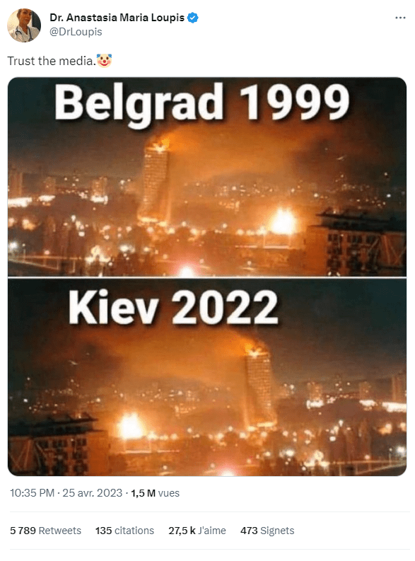En revanche, et ce dès le 24 février 2022, certains internautes sur Twitter (ici, ici ou encore ici) partagent l’image pour dénoncer le bombardement sur Belgrade et ainsi minimiser l’invasion russe en Ukraine.