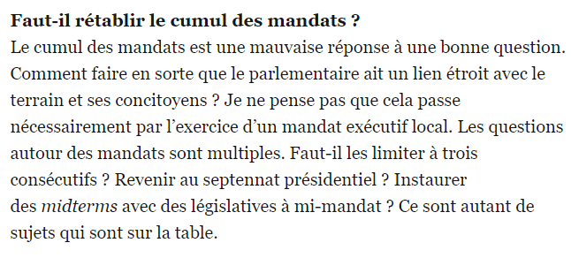 « Faut-il limiter les mandats à trois consécutifs ? Revenir au septennat présidentiel ? Instaurer des midterms avec des législatives à mi-mandat ? »