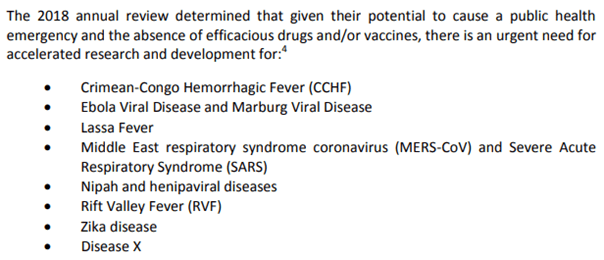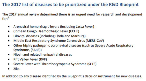 De cette volonté de se préparer aux prochaines pandémies est née une liste de maladies dites prioritaires à surveiller dont la première a été établie en décembre 2015 avec 8 maladies (Fièvre hémorragique de Crimée-Congo; Maladie à virus Ebola; Maladie à virus Marburg; maladie à coronavirus MERS & SARS; virus Nipah; fièvre de la vallée du Rift).