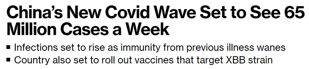 À partir de 8 minutes de vidéo, Philippot aborde le deuxième sujet, celui de la « vague géante » de Covid. Selon lui, l’émergence de ce sujet serait lié à « une analyse de Bloomberg [avec] le titre : Une nouvelle vague de Covid-19 en Chine va provoquer 65 millions de cas par semaine » publiée le 22 mai 2023. Il affirme faussement, une phrase plus loin, que le titre de l’article serait incohérent avec le contenu de ce dernier car « le titre c’est « va provoquer » et quant on commence à lire « est susceptible de » ».