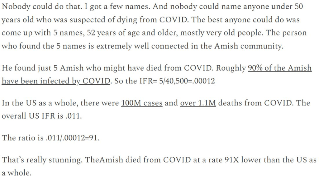 Néanmoins lors de cet audit, Kirsch ne présente aucune étude mais des calculs qu’il a fait lui même. Le détail est présenté sur son propre blog dans un post publié le 29 mai (https://stevekirsch.substack.com/p/breaking-the-us-covid-mitigation?publication_id=548354&post_id=124382966&isFreemail=true…). Selon lui, les Amish ont un taux de mortalité dû au Covid 90 fois inférieur de celui en population général.