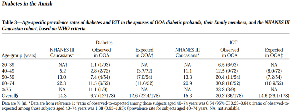 D’autre part, les maladies suscitées ne sont pas absentes de ces communautés. En effet, un papier de mai 2010 intitulé « Prevalence Rates of Autism Spectrum Disorders Among the Old Order Amish » avait conclut que « les données préliminaires ont identifié la présence de TSA [Troubles du spectre autistique] dans la communauté Amish à un taux d’environ 1 enfant sur 271 ». Dans un article de septembre 2009 sur le taux d’incidence des cancers chez les Amish de l’Ohio, les auteurs indiquaient que les cancers étaient, certes, moins nombreux dans cette communauté mais n’étaient pas absents avec 191 cancers identifiés. Même constat dans une étude d’août 2020 réalisée sur 5 377 individus du comté de Lancaster ou encore dans celle-ci de mai 2000. Les taux de diabète et d’hypertension étaient plus faible chez les Amish mais bien présent.