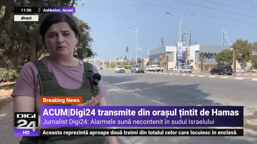 Comme l’indique le bandeau de l’extrait vidéo, les images proviennent de la chaîne d’information en continu roumaine Digi 24. Une recherche inversée permet d’identifier rapidement la journaliste à l’écran, il s’agit de Cristina Cileacu. Cette dernière est bien présente en Israël depuis une dizaine de jours comme le montrent ses diverses publications sur son compte Facebook.