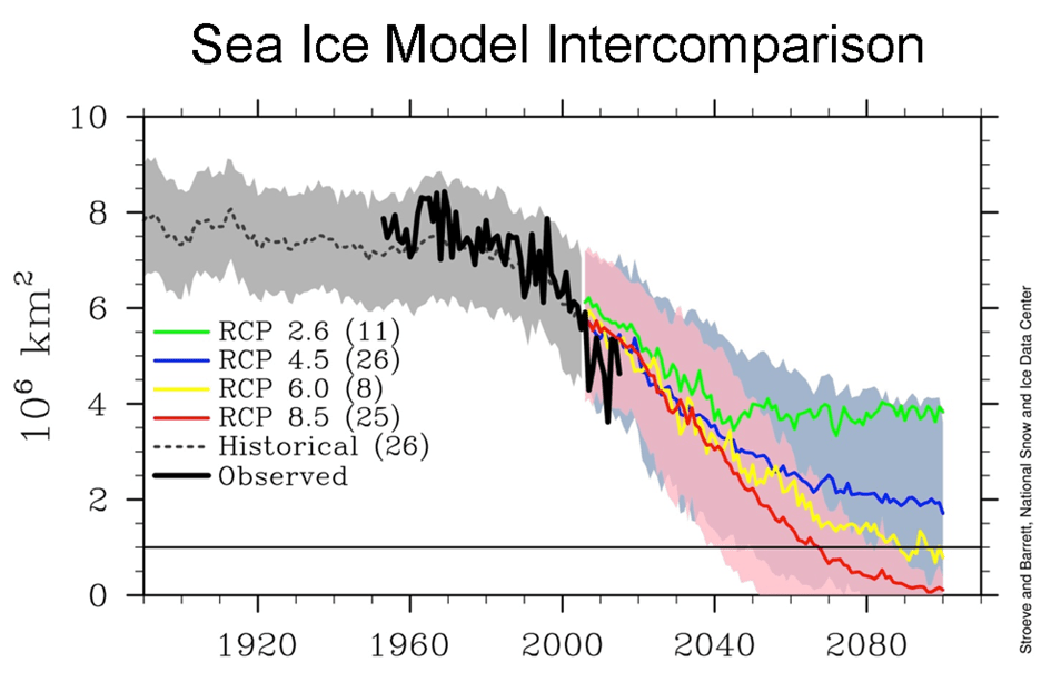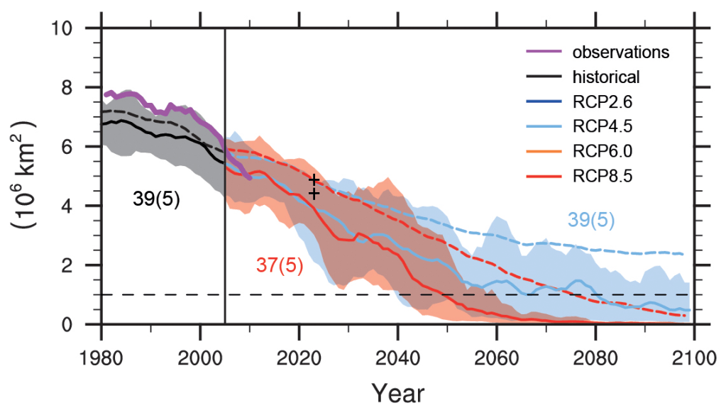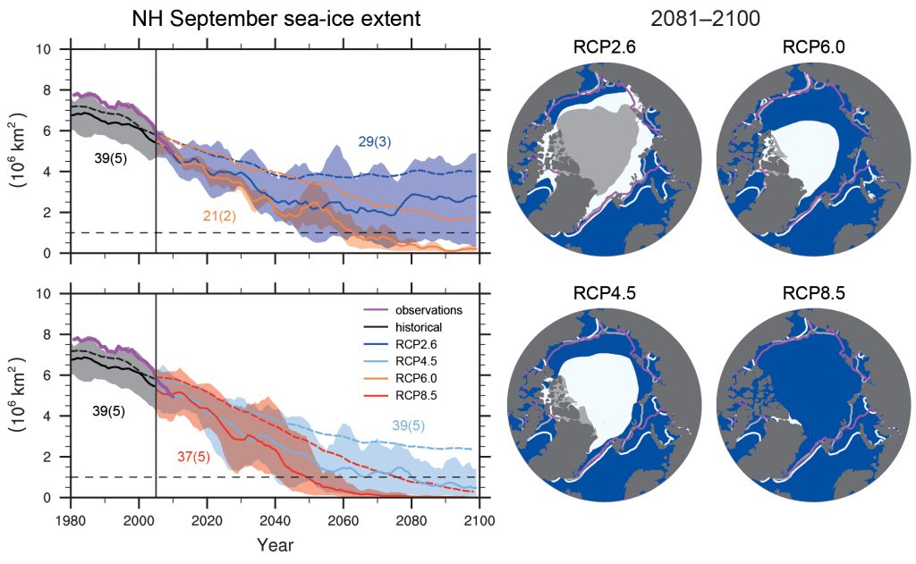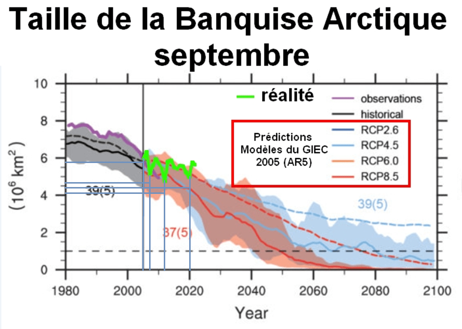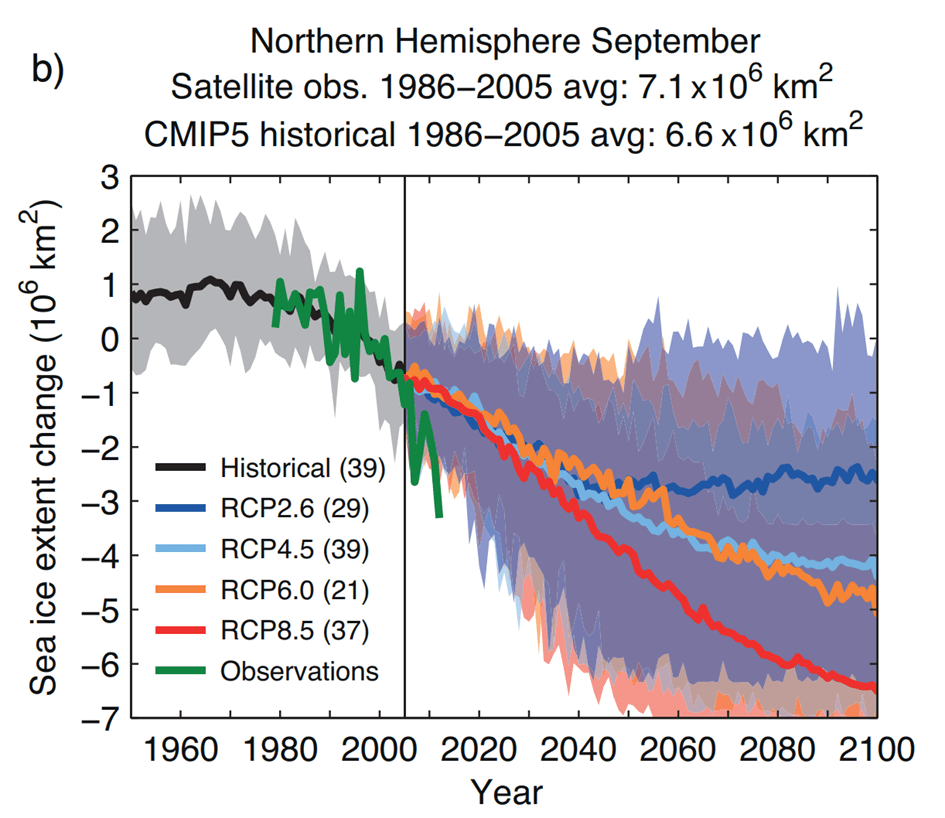 Par conséquent, les derniers rapports du GIEC sont bien plus représentatifs du consensus scientifique : les modèles de projection sont en adéquation avec les observations de la SIE faites par les différents organismes. À titre de comparaison, le NSIDC avait, en 2015, superposé ses données d’observations avec celles des modèles du CMIP5.
