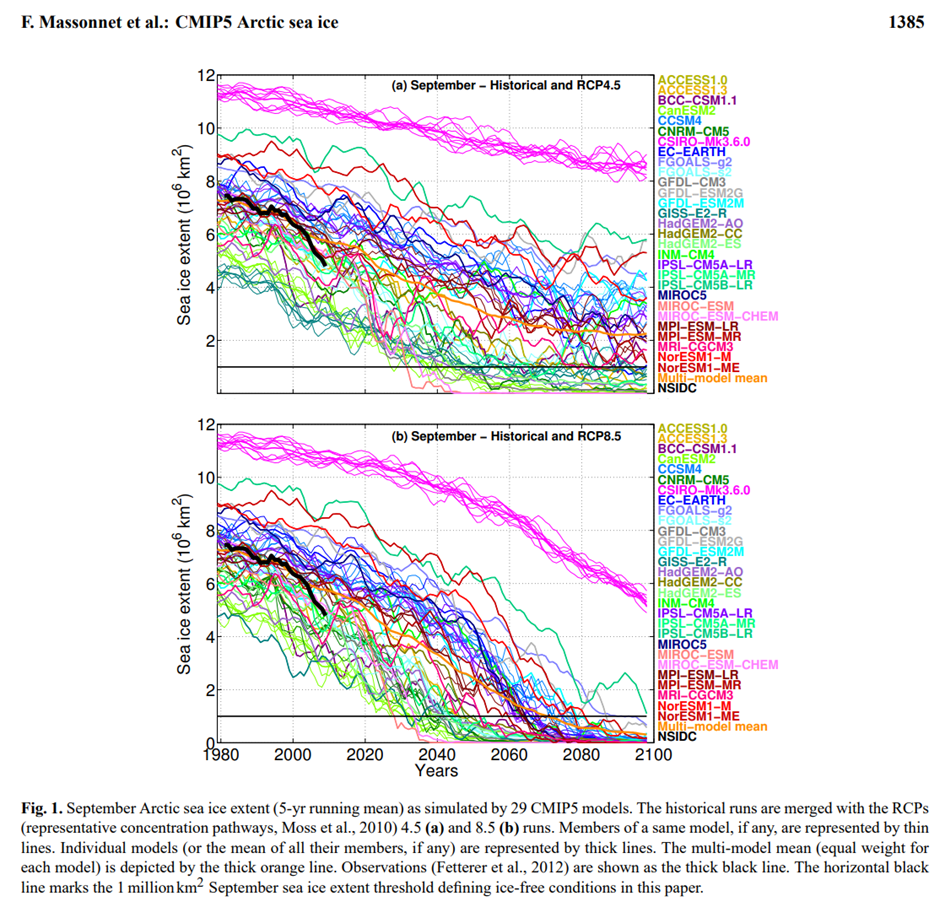 Pour y répondre nous avons cherché à connaître la méthodologie employée et les sources du graphique. Des précisions sont apportées dans le Chapitre 12 de l’AR5 intitulé : « Long-term Climate Change : Projections, Commitments and Irreversibility« . La partie 12.4.6.1 (pp. 1087-1092) s’intéresse spécifiquement à la question des changements de l’étendue de la glace de mer. On y trouve de nombreuses références scientifiques dont l’article de Massonnet et al., 2012 intitulé « Constraining projections of summer Arctic sea ice« . Cette étude a simulé l’étendue de la glace de mer à l’horizon 2100 à partir des 29 modèles du CMIP5 en la comparant aux données d’observation (voir Fig. 1). En légende de la figure ainsi que dans la partie méthodologie, il nous est précisé que les données d’observation sont issues du National Sea and Ice Data Center (NSIDC), non celles de l’OSI SAF.