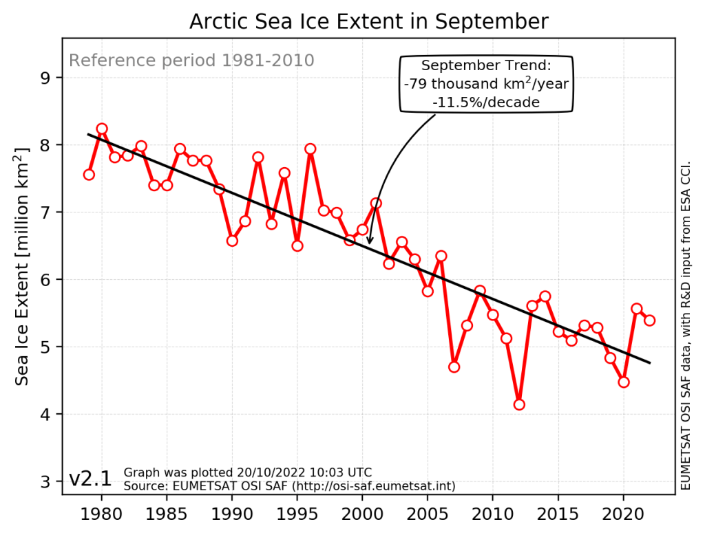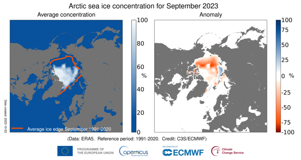 Première erreur de la publication : la moyenne de l’étendue de la glace de mer arctique en septembre 2023 n’est pas de 5.4 millions km² comme l’affirme l’internaute mais de 4.8 millions selon l’OSI SAF.