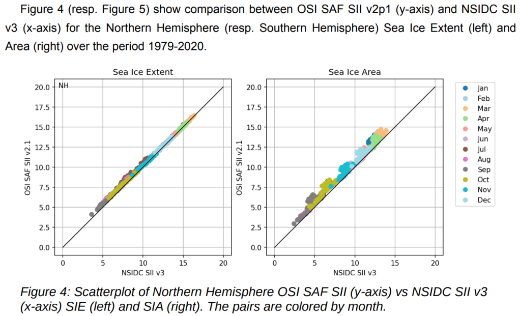 L’OSI SAF a d’ailleurs réalisé une comparaison entre leurs données et celles du NSIDC dans ce document de 2020. L’explication pourrait provenir de la détection des masses terrestres côtières dont l’émissivité est similaire à celle de la glace créant un « land spill-over effect« . L’OSI SAF reconnaît que leurs données sont possiblement faussées de ce fait :