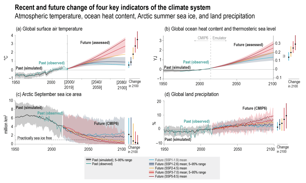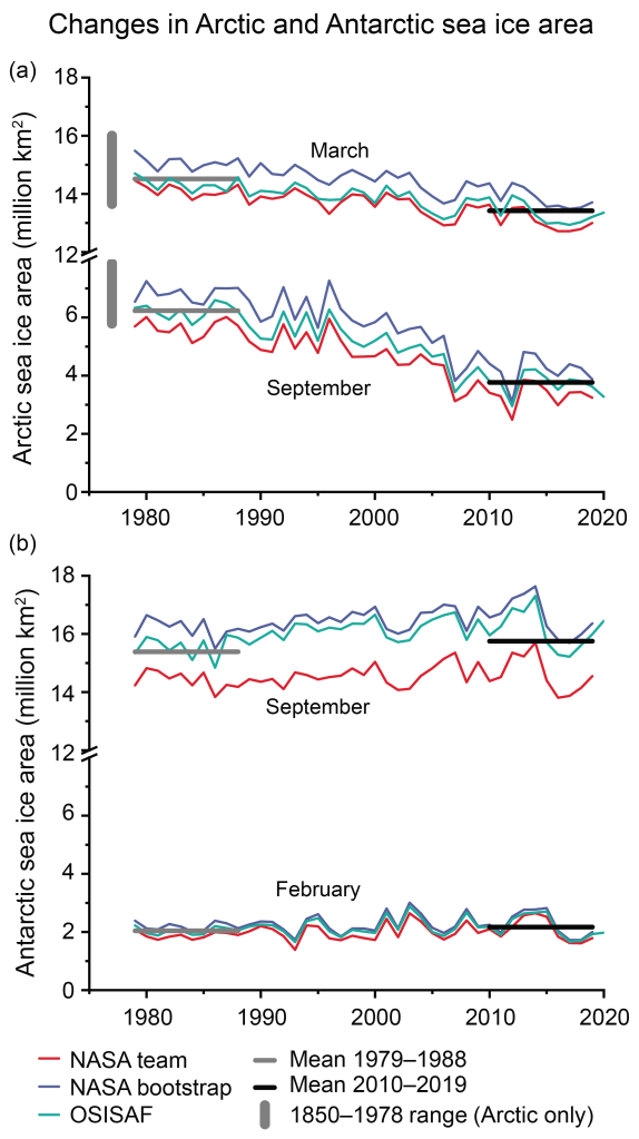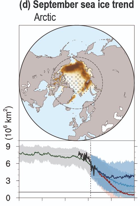 Le même constat est réalisé lors du sixième rapport du GIEC en 2023 : « The Arctic Ocean will likely become practically sea ice free during the seasonal sea ice minimum for the first time before 2050 in all considered SSP scenarios » (chapitre 9, « Sea Ice« ). Les modèles de simulation du CMIP6 y sont comparés aux données d’observation et comme pour le SROCC, plusieurs jeux de données sont utilisés et même comparés entre eux comme visible dans la figure 2.20. La figure TS.8 (voir ci-dessus) réalise, elle aussi, une moyenne de ces mesures.