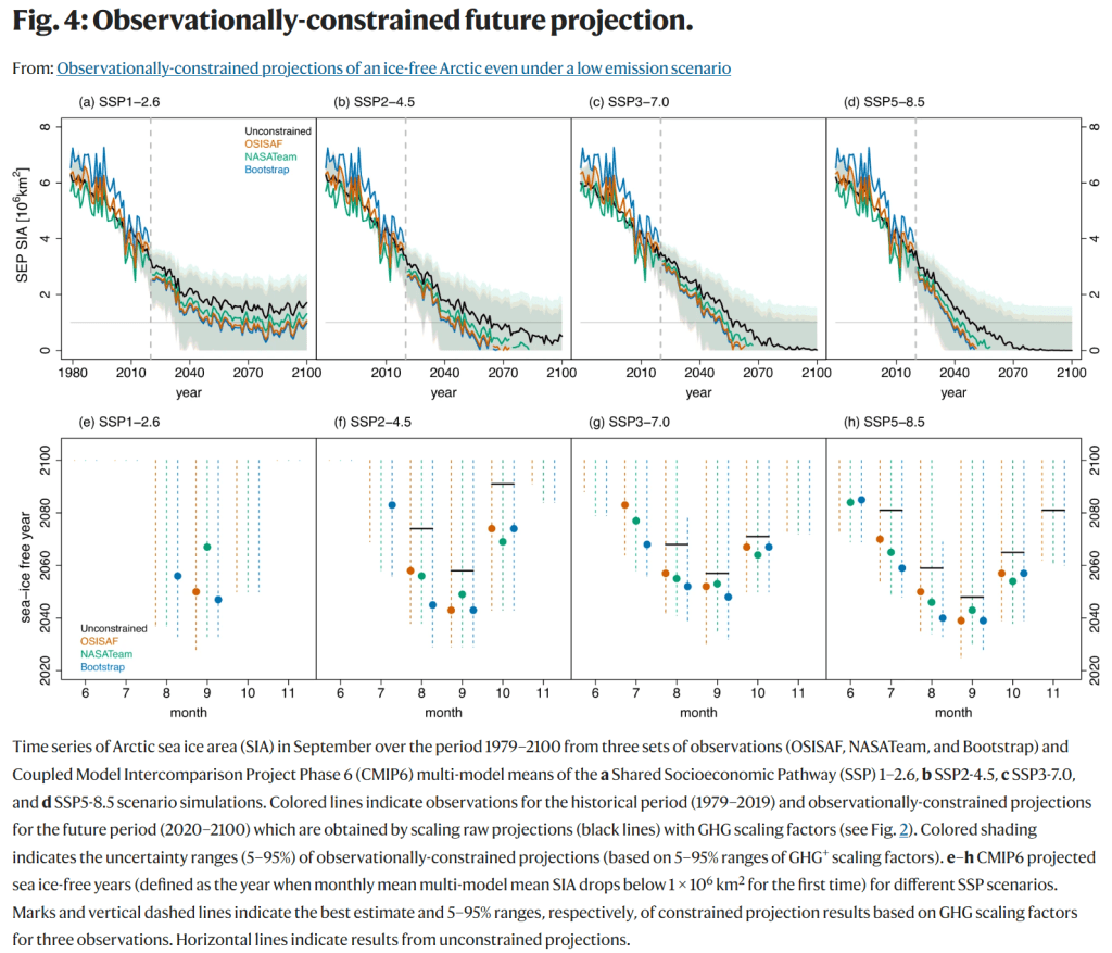 Même son de cloche dans cet article scientifique publié dans la revue Nature en juin 2023 et intitulé « Observationally-constrained projections of an ice-free Arctic even under a low emission scenario ». La figure 4 est composée des mesures de l’OSISAF, de la NASATeam et de Bootstrap comparées aux scénarios 2.6, 4.5, 7.0 et 8.5.