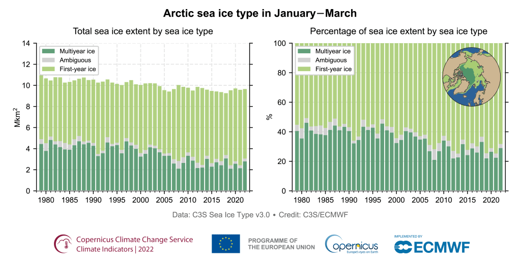 Enfin, l’étude de la SIE n’est pas suffisante pour comprendre les mécanismes à l’œuvre en Arctique. La banquise est, en effet, sujette à d’autres phénomènes : perte d’épaisseur, changement du type de glaces par exemple. Comme le rappel Copernicus – un programme de l’Union européenne dédié à l’étude du climat – dans cet article dédié à l’évolution des glaces de mer : « les concentrations [sont] inférieures à la moyenne sur la majeure partie de l’océan Arctique ». De plus, « le type de glace de mer dans l’Arctique change également« . Egalement, les glaces pluriannuelles régressent au profit des glaces de première année, passant de 41% entre 1980 et 1989 à 27% ces dix dernières années.