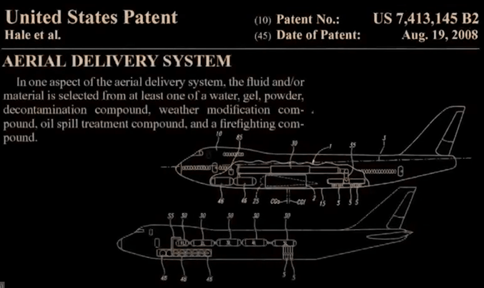 Enfin, nouvel appel du pied à l’imaginaire des habitués : les brevets de dispositifs d’épandage. Plusieurs d’entre eux sont présentés à l’écran. Premier de cette liste, le Patent US7413145B2 intitulé « Aerial Delivery System« . Celui-ci est en réalité un dispositif de lutte contre les incendies. Pourtant clairement évoqué dans l’abstract du brevet, l’image choisie dans le reportage coupe volontairement cette information.
