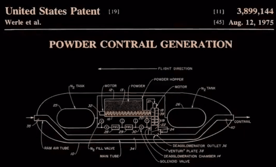 Même subterfuge pour le brevet US3899144A dont n’est présenté qu’un schéma au titre évocateur : « Powder contrail generation« . Comme pour le brevet précédent, le reportage se garde bien de préciser que le matériel est destiné à créer des fumées lors des parades militaires ou lors de tests militaires. Inventer un dispositif rendant visible une action secrète… Particulièrement incohérent.