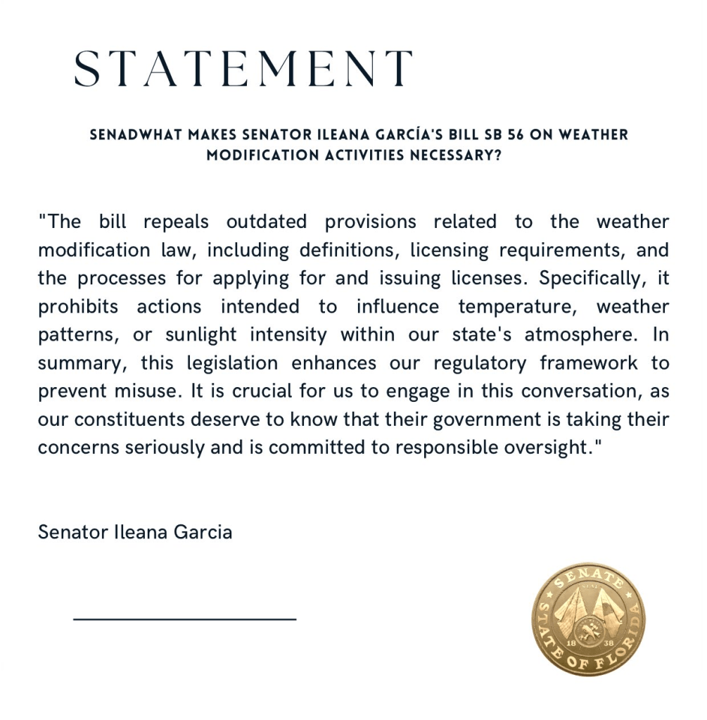 Soutien inconditionnel du président de l’organisation Children’s Health Defense, Ileana Garcia embarque, avec elle, la Floride au cœur cette zone grise. Dans un projet de loi déposé au Sénat de l’État le 11 novembre 2024 (SB 56), l’élue républicaine propose d’interdire toute pratique impliquant « l’injection, la libération, ou la dispersion, par tout moyen, d’un produit chimique, d’un composé chimique, d’une substance ou d’un appareil dans l’atmosphère à l’intérieur des frontières de cet État dans le but exprès d’affecter la température, le temps ou l’intensité de la lumière du soleil« .