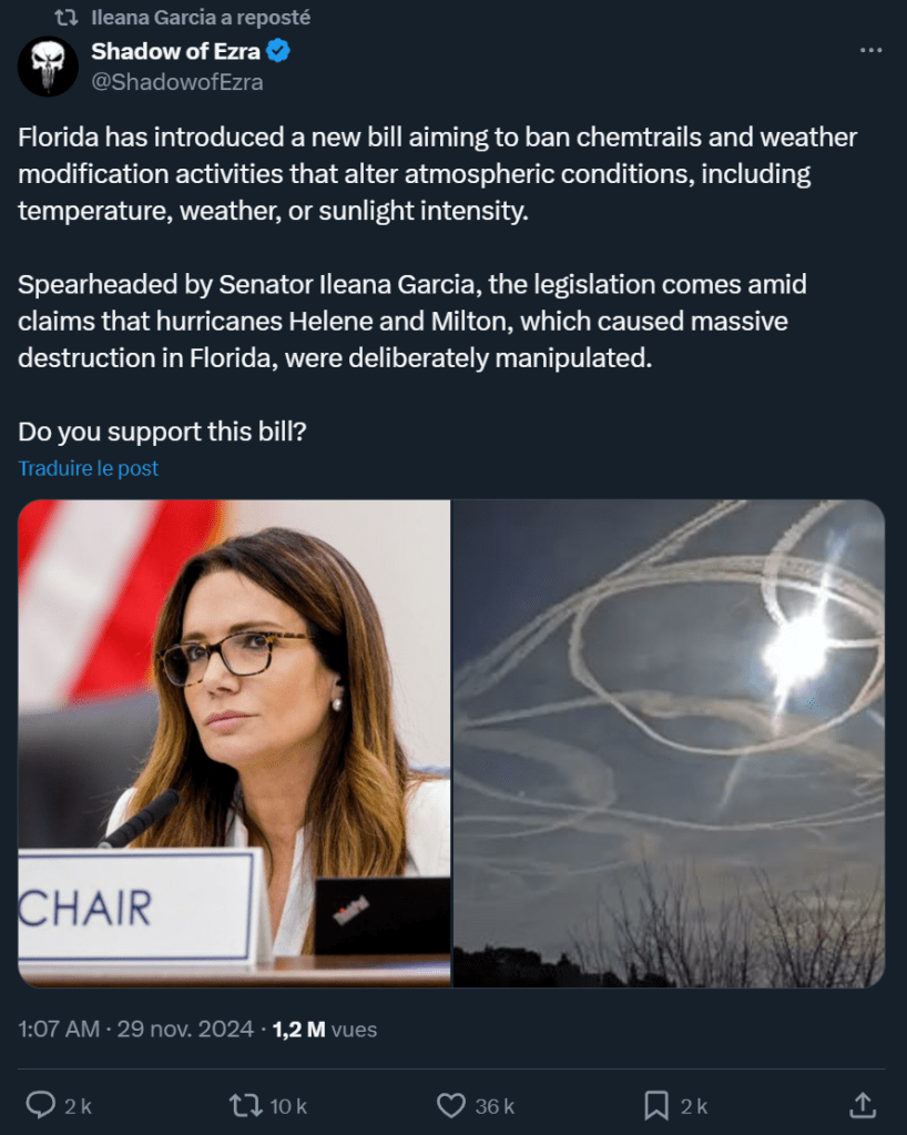 Le texte floridien n’a pas encore été soumis aux débats parlementaires, et ses promoteurs ne se sont pas exprimés publiquement à son sujet. Cependant, cette discrétion contraste avec l’activité frénétique d’Ileana Garcia sur son compte X. En l’espace de cinq jours, la Républicaine a dégainé à huit reprises, un rythme soutenu au regard de son activité habituelle. D’autant plus frénétique qu’il interroge : la moitié de ces publications mettent en exergue des comptes ou des propos favorables à la théorie des « chemtrails« .