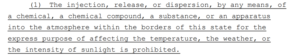 Seule exception : la Senate Bill 2691 du Tennessee. Promulguée en avril et entrée en vigueur au 1er juillet 2024, elle interdit « l’injection, la libération ou la dispersion intentionnelles, par quelques moyens que ce soit, de produits chimiques, de composés chimiques, de substances ou d’appareils à l’intérieur des frontières de cet état dans l’atmosphère dans le but exprès d’affecter la température, les conditions météorologiques ou l’intensité de la lumière du soleil« . La formulation est précisément celle employée par la sénatrice du 36e district de Floride : un copier-coller en bonne et due forme révélateur des influences de cette loi.